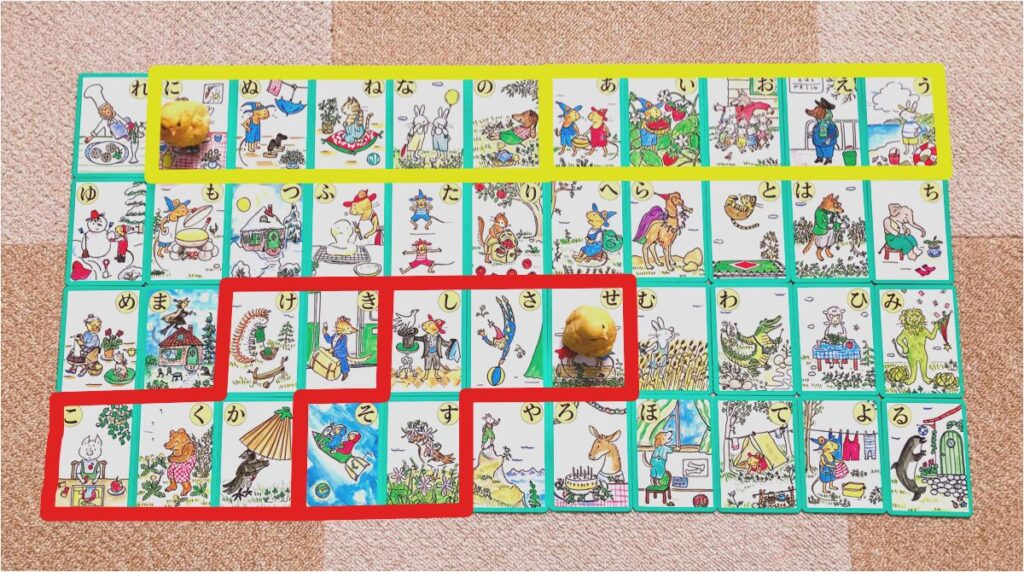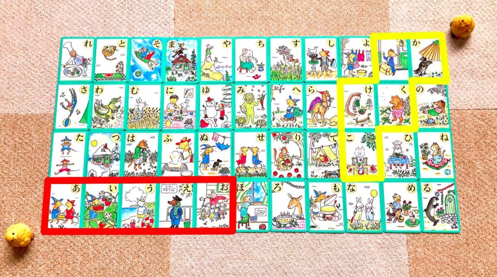 さて、どのようにコマを動かすかですが、コマは「五十音表のいずれかの行が並んだ道の上」だけを通れます。例えば写真赤枠のように、『あいうえお』の5枚の札が隣り合わせに並んでいたら、コマは『あ』を通って5マス進んで『お』まで行けます。5枚の札の順序は問いませんので、『あいうえお』の代わりに『えうあおい』などと並んでいても構いません。また隣接さえしていれば、写真黄色の『かきくけこ』のように、途中で曲がっても構いません。『やゆよ』は3文字そろえばOKですし、『わ』は1文字だけで進めます。